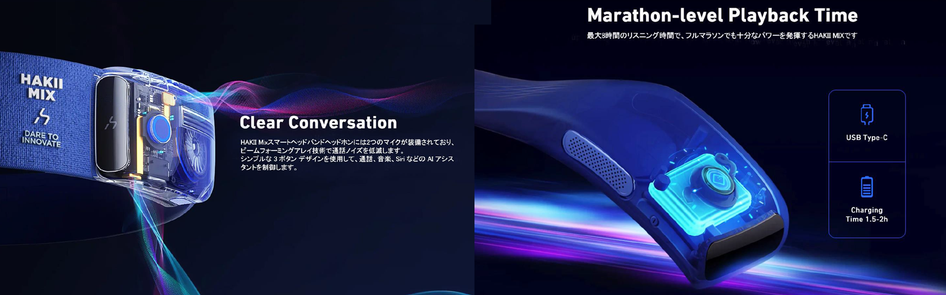 ビームフォーミングアレイ技術で通話ノイズを低減、最大 8 時間の再生時間を持つ HAKII MIXは、フルマラソンにも十分なパワーを発揮します。