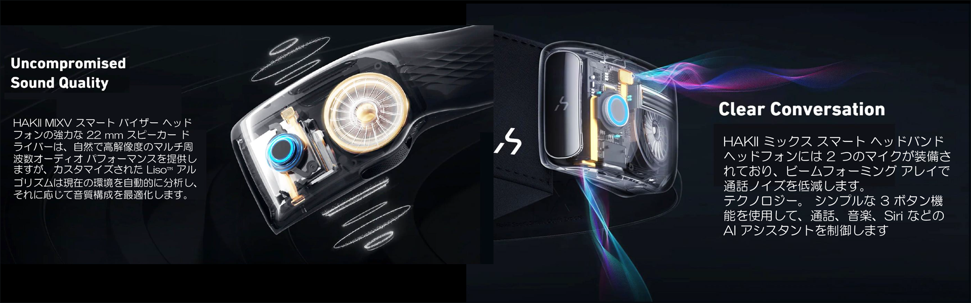 ディレセメンタルサウンドを使用することで、耳を覆ったり、骨伝導イヤフォンのように不自然な振動を引き起こしたりすることなく、標準ヘッドフォンと同等またはそれ以上のリスニング体験を提供します。